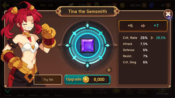 玩家可以通过宝石的数值型和百分比型增加星兽的攻击、防御、生命值、恢复能力等。恢复型宝石对蓝球、红球的回复量有显著影响,还能提升大招回血效果。需要特别注意的是,宝石有不同的星级,等级从1到6,最高可以升到+15。在升级过程中,宝石每达到3、6、9、12级时,会解锁副属性,副属性的数量和品质会随升级进程增加。副属性的提升是随机的,副属性越多,宝石的价值也越高。