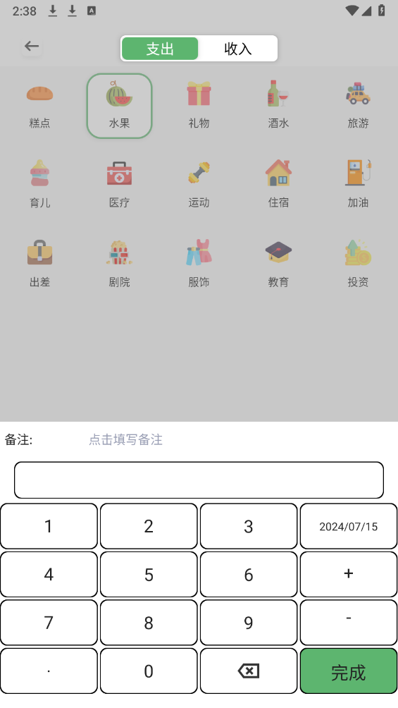 4、选定对应账目类型后,准确填写收支金额,确认信息无误后点击“完成”,即可完成记账。