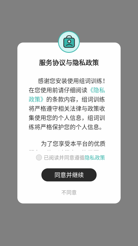 1、下载并安装组词训练app,完成安装后启动软件,仔细查看相关政策与协议并点击同意。