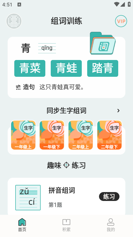 3、切换至“积累”页面,点击页面右上角,可选择对应年级和词语类型,针对性开展学习。