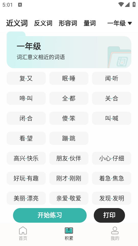 4、【积累】模块:搜集海量近义词、反义词、形容词、量词,同步配套对应练习,强化知识积累。