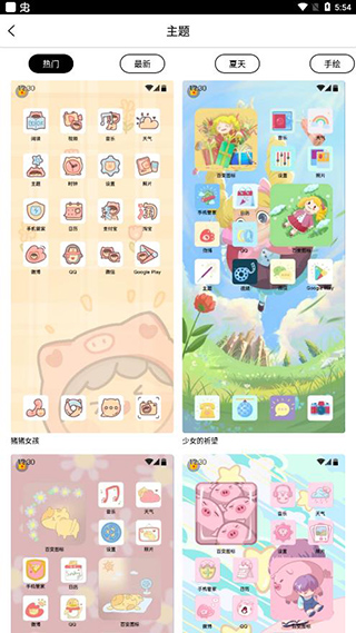 2、涵盖清新、科幻、风景、可爱等多种风格的图标主题与壁纸,适配不同喜好。