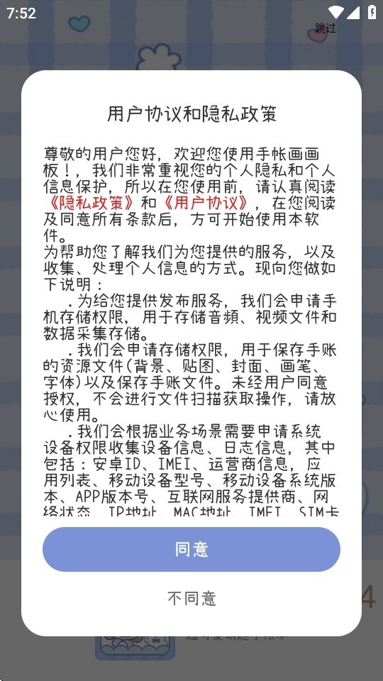 1、打开并进入手帐画画板,仔细阅读用户协议与隐私政策后,点击“同意”即可进入。