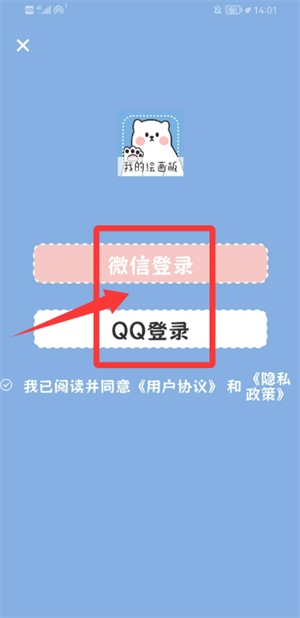 1、打开画画小黑板应用,勾选相关协议,选择社交账号完成登录操作。