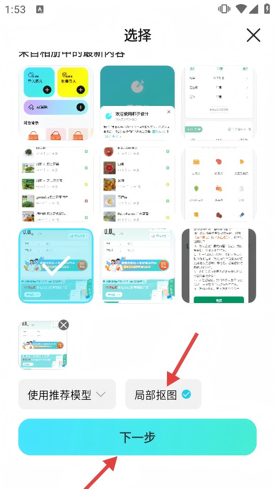 2. 选定需要抠图的图片后,勾选“局部抠图”选项,点击页面底部的“下一步”,进入抠图编辑界面。