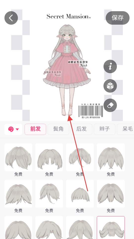 4、在捏制界面,可选择前发、鬓角等不同部位样式,挑选素材定制角色形象。