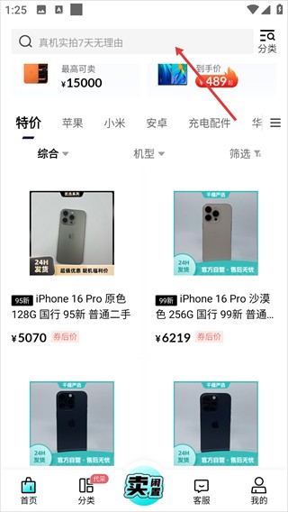 1、在软件顶部搜索栏输入目标机型,点击搜索获取相关商品。
