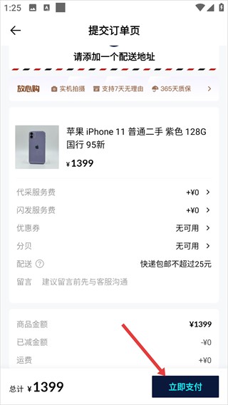 3、点击页面底部的“立即购买”按钮,跳转至提交订单页面。