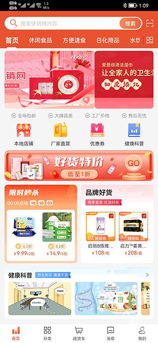 1、打开并进入快销网软件首页,可查看限时秒杀板块,其中有家庭好货打折、品牌正品上新,还有超多品牌入驻,选择丰富。