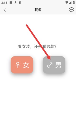 1、进入我型软件后,会出现“看女装”“看男装”的提示语,根据自身需求选中分类进入,右上角还有参考信息可点击查看。