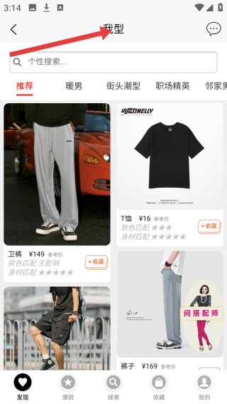 2、在我型发现页面,有低价卫裤、T恤参考图,还有肤色匹配、身材匹配指数,方便顾客参考挑选和购买。