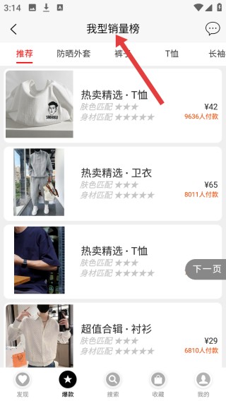 3、查看我型销量榜单,可选购心仪衣服,平台聚集海量商品,还有防晒外套、裤子、T恤等多种分类供选择。