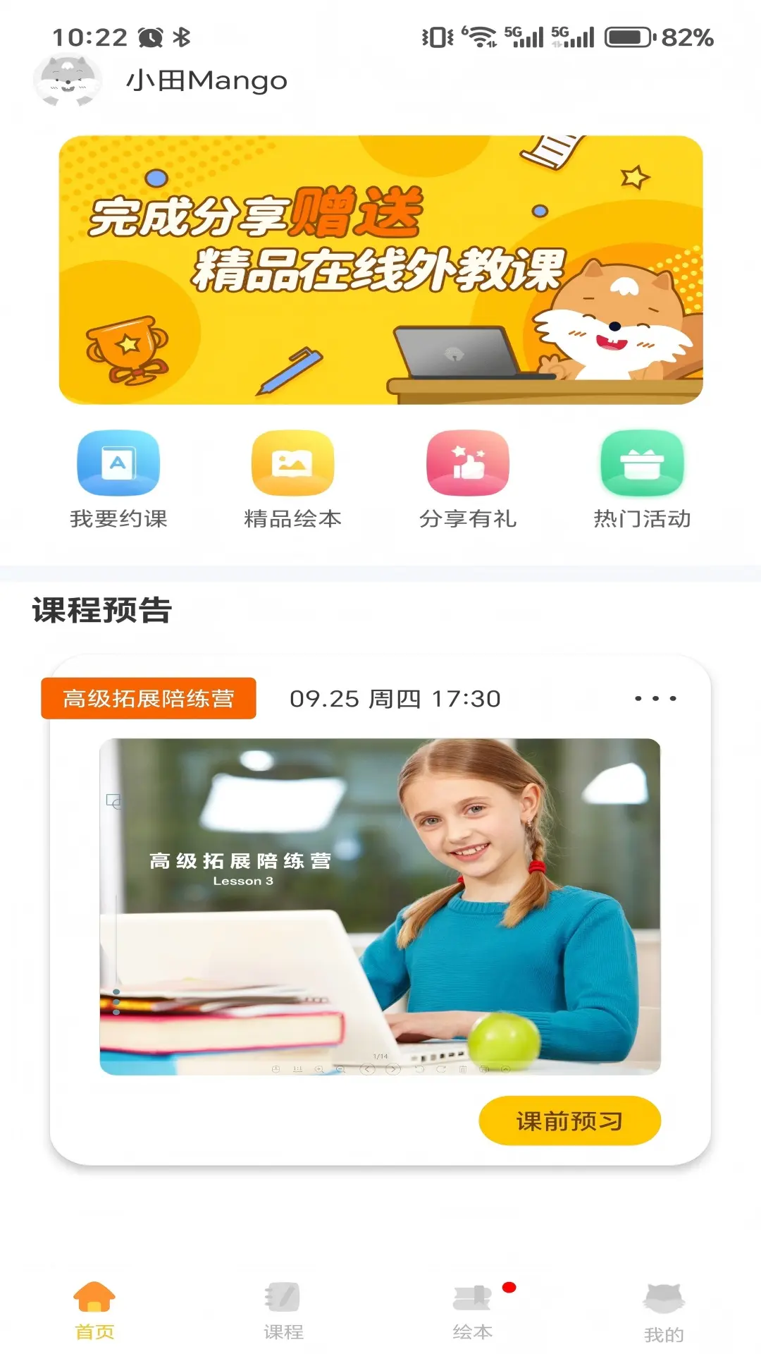 3、登录应用即可领取免费外教课程,配合专业测评,为孩子制定个性化学习方案。