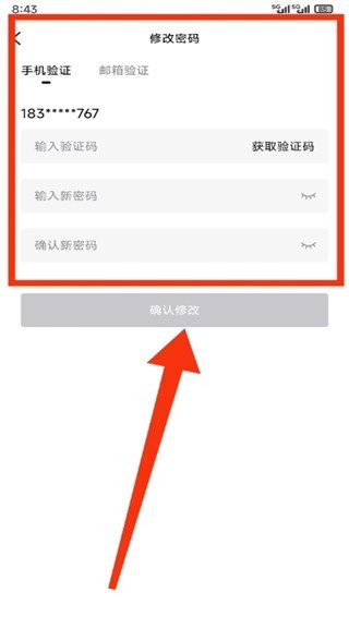 3、按照页面提示完成手机验证,输入收到的验证码后,填写新的密码并点击确认修改。