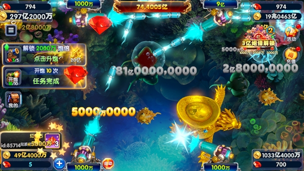 2.超高倍率,不止百万倍:拒绝低倍率遗憾!在这里,十万倍、百万倍倍率轻松爆出,让你沉浸式体验一夜暴富的快感,捕鱼更具成就感。