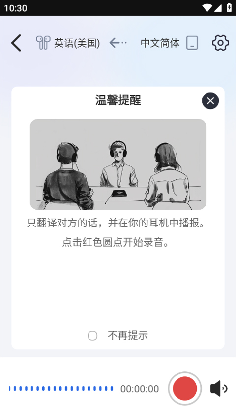 4、将翻译内容通过耳机播报,按下红色圆形按钮即可启动录音。