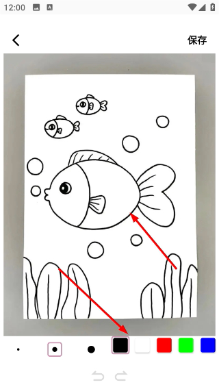 2、涂鸦时可先选择底部的黑色画笔,在画布进行绘制完成后点击右上角的保存按钮留存作品。