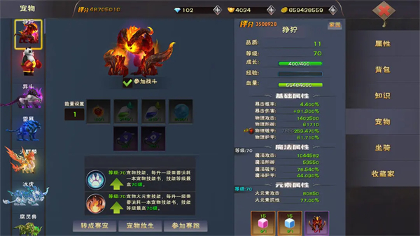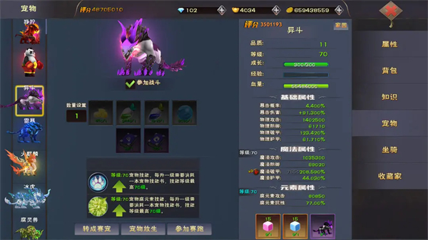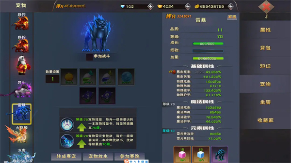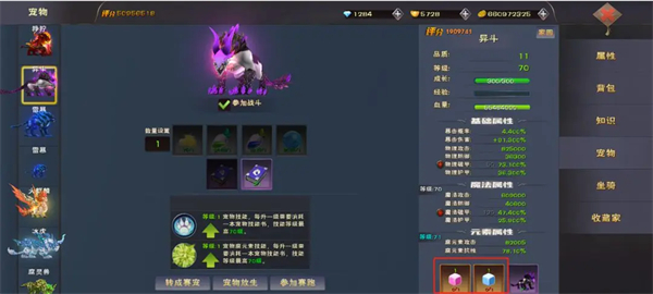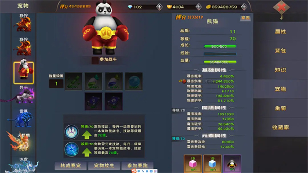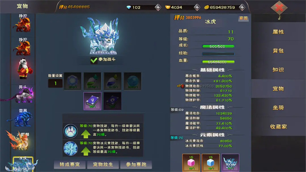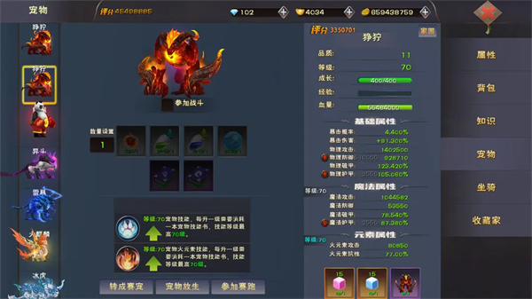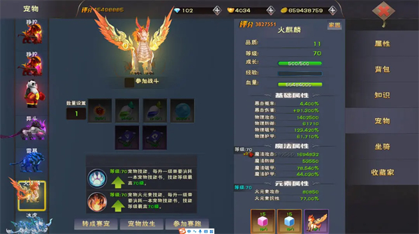 3. 同时宠物还拥有元素属性,使用元素技能书可提高宠物的元素攻击力。