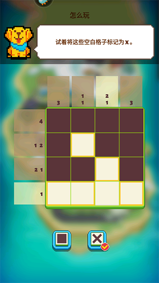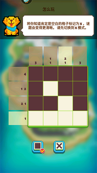 4、将你知道肯定是空白的格子标记为x,谜题会变得更清晰。请先切换到x模式。