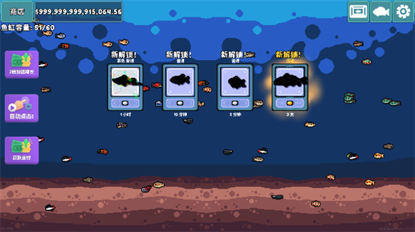 3、自由装扮水族馆:可通过游戏内货币解锁多款风格各异的鱼缸与装饰道具,自由搭配布局、组合装饰,打造独一无二的个性化专属水族世界,彰显个人审美。