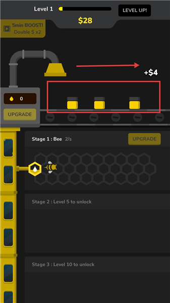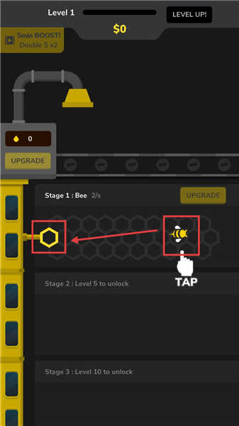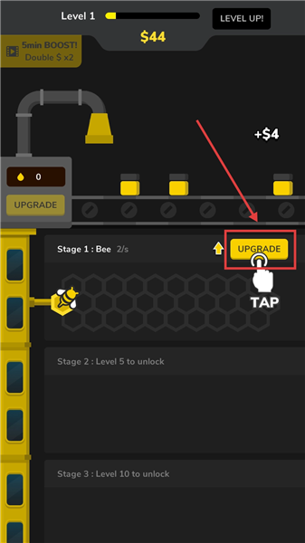 3、等攒够钱了,就点击Stage1旁边的【UPGRADE】按钮,这样能提高蜜蜂的采蜜效率,让赚钱速度更快一些。