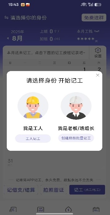 3、工地便捷记工:路径:首页→“记工”→选择员工→填写工天/工时→添加备注信息。