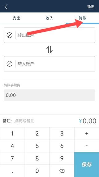 2、转账页设支出、收入、转账标签,切换至转账栏填写转出转入账户,录入手续费与备注,数字键盘辅助输入,一键保存。