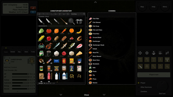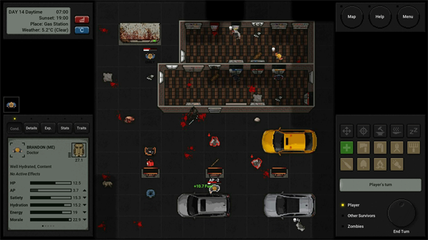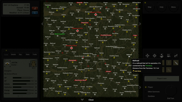 终点站:僵尸幸存者使用俯视角度进行,搭配像素风格,玩家可以一眼看完地图上的所有配置,事先考虑行动点数配置与接下来的行进路线。 呼应游戏标题终点站名称,玩家的目标是逃离城市、抵达终点,而前往目标可以沿着铁轨走,也能去码头坐船,或是搭乘直升机从空中穿越,只是要注意不管是哪种方式都需要先准备对应的道具,玩家要做的就是先寻找收音机听取广播消息,获得正确的终点位置。