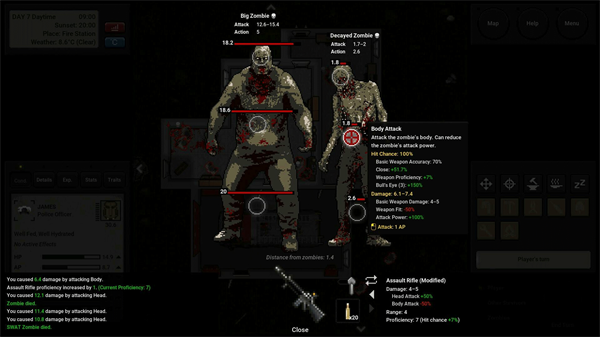 面对袭来的僵尸群,你可选择种类丰富的工具和武器发起攻击。你能自主选择攻击僵尸的身体部位,若不确定最佳策略,直接打掉僵尸头颅或摧毁其大脑即可。