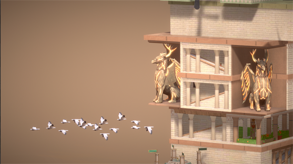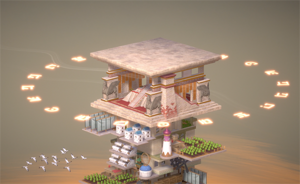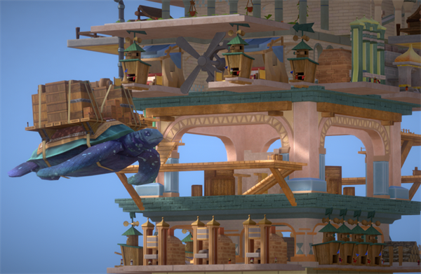 人类文明虽然已在天灾后摇摇欲坠,仍有部分旅者独自驾驶着海龟在高空中穿梭。建造海龟港,海龟将携带着来自远方的货物,在这座摘星巨塔周边巡游。