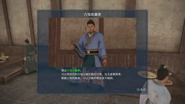 6、古币收藏家:可以用古币兑换武器的竹简、宝玉和家具等。游戏中现在分为布货,刀钱,蚁鼻钱,环钱四种古币,其中蚁鼻钱可以用来兑换终极武器的竹简。古币可以通过狩猎点数、主线战场、击杀野外的盗贼头目以及钓鱼等获取。