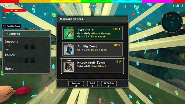6、击败怪物会掉落经验值,拾取后可升级,每次升级可随机选择新技能或强化效果。