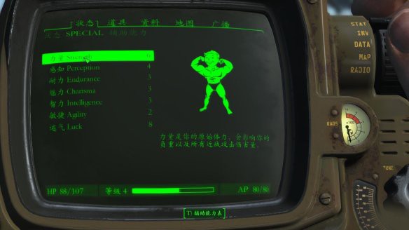 感知:指你对环境的察觉力和“第六感”,且会影响V.A.T.S.的武器命中率。