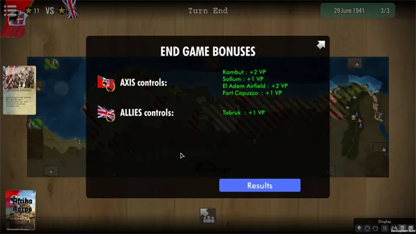 如果场景没有因为达到某些突然死亡条件而结束(例如轴心国占领亚历山大港和苏伊士,或盟军在 SGS 非洲军团中夺取的黎波里),则游戏期间累积的胜利点数将用于确定谁赢得了比赛。