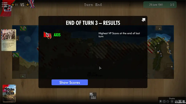 会因他们控制的一方获得胜利点 (VP),分数用于在游戏过程中占领关键地点(城市、堡垒等)、摧毁特定单位(例如装甲单位)以及场景结束时控制的特定区域。此外,游戏的卡牌还提供或花费 VP。场景结束时得分较高的玩家通常会赢得游戏,除非场景具有可能占上风的特定胜利条件(例如占领给定位置或达到特定指数)。