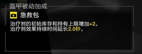 急救包的效果就是让你的治疗剂的上限从4变成6 且你扎针后会有4秒的持续恢复时间,这期间只要你收到非致死伤害你都会回满血,且你的耐力条不会消减。
