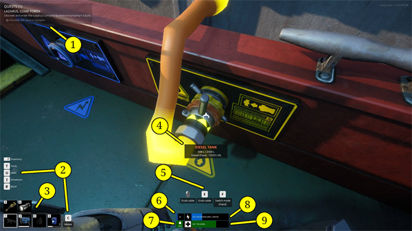 8、电池:底部的蓝色长条显示您的电池电量。如果它耗尽到 0,你将开始失去生命值,直到你重新充电。大多数动作都需要电池电量,即使您站着不动,电池电量也总是会慢慢耗尽。