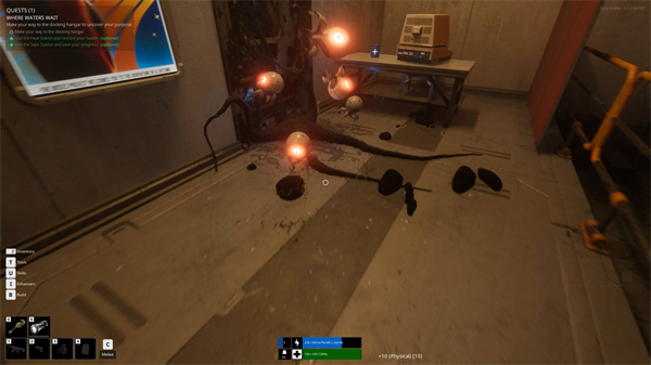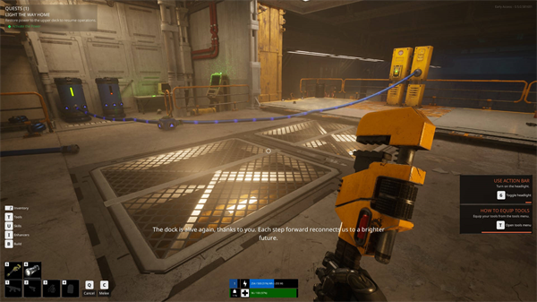 接下来,取出您的修复工具(热键栏上的默认为 5)。修理开关,然后拉动它;机库里的灯会亮起来。不再有黑暗(至少在机库里)!
