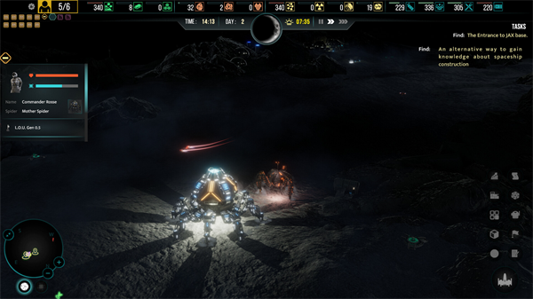 机甲可建造建筑(如资源站、医疗舱)、研究科技、强化队员能力,助力穿越月表。可选择强化采矿效率保资源,或提升移动速度躲日光,切忌久留一地。