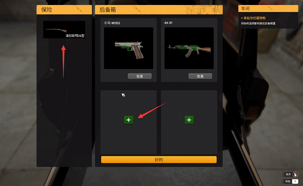5、最后点击“加号”,就可以在左边找到这把温彻斯特了,点击它就能将它放入后备箱里后备箱。