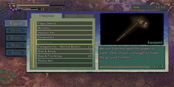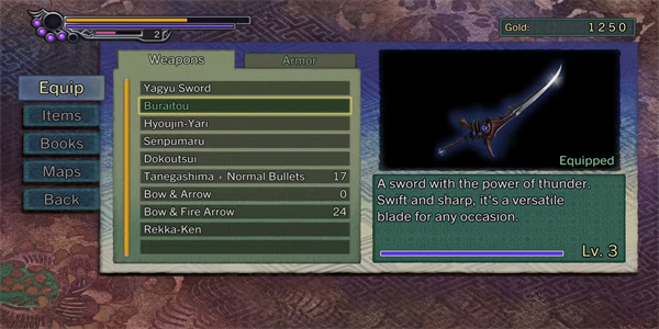 被称为千风丸的双刃剑是游戏中最全面的武器。这是一种风系武器,会从十兵卫所在的位置制造龙卷风漩涡。这也是对付一群敌人的好特殊技,但更偏向防御。虽然它在屏幕上锁定的敌人数量比独库水少,但千风丸使用速度更快,且只需普通攻击即可击中多个敌人。它是鬼武者系列中最酷的武器之一,解锁后,玩家在大多数遭遇中可能会忘记其他武器。