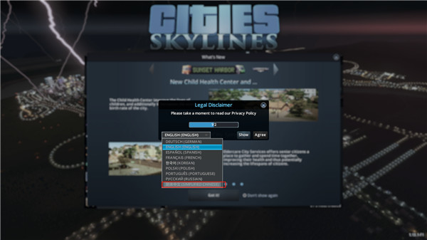 1、下载并解压本站提供的压缩包,运行CitiesSkylines.exe程序启动游戏,来到游戏界面选择简体中文语言;