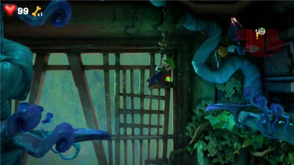 5、进入房间左边吸取掉树木,再出去上楼梯,进入左边的房间,把地上的木块砸向厕所,然后再拉取树藤,就可以继续前进了,
