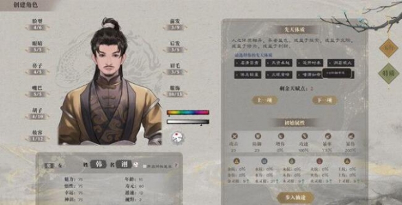 4、在选好五行后,需要做的是分配8个天赋点,灵根资质建议优先选择天灵根,为人处事可以任意选,尽量选择占优势的,修行感悟的话选择自己需求更多的要素,并留意缺点要素。