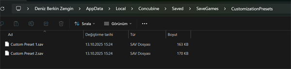 5、转到 C:\Users\YOURUSERNAME\AppData\Local\Concubine\Saved\SaveGames\CustomizationPresets,您可以在那里看到您的预设,重命名它并根据需要共享。