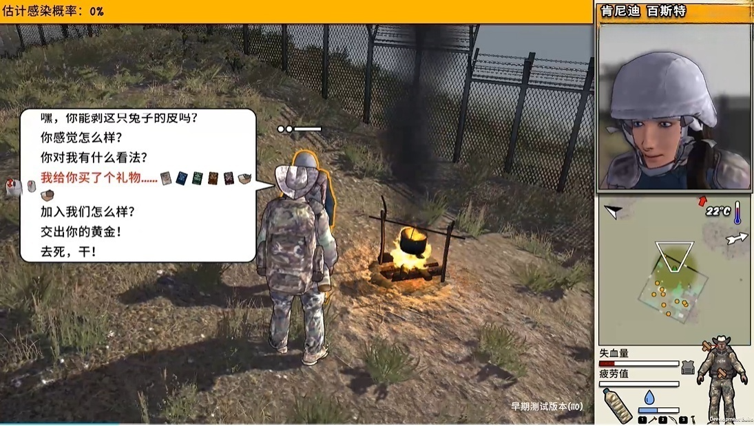 利用潜行机制搜寻僵尸、野兔与其他人类,潜入敌人视野完成暗杀,能将目标击倒后搜刮其物资。可投掷瓶子、肉块等物品分散僵尸的注意力,穿戴迷彩服能有效提升潜行能力。野兔与僵尸均拥有敏锐的嗅觉,探索时需时刻关注风向,避免暴露自身位置。