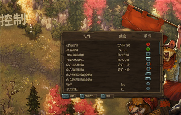 5、点击操作选项,我们可以看到游戏的操作控制键,游戏自身的默认键和手柄按键是非常合理的,如果玩家觉得不太适应有些按键配置,可以在自定义中对其进行修改,