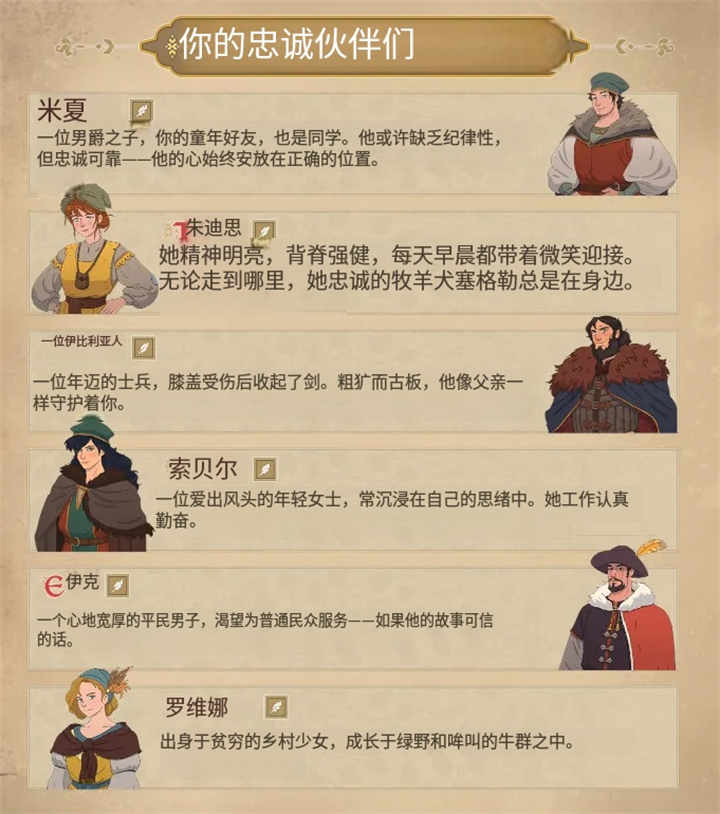 你将带着六个同伴开始,有些从小就认识,有些是在前往芒塔尔巴之前相识的。随着游戏进展,你会在故事中遇到新盟友,其中一些会成为你的新伙伴。他们每个人都会有一条特殊的任务线,你会发现更多他们的性格和动机。