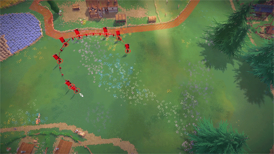 1、阡陌交通,自然生长:挣脱网格设计的束缚,运用专属区域规划工具,打造有生命、会呼吸的特色聚落。村民日常通行的区域,会自然形成蜿蜒小路,勾勒出错落有致、不断迭代的城市与田野交融风光。