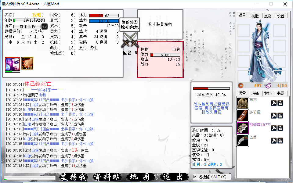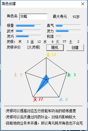 1、与其他版本相同,建立人物,可以无限随机初始属性,不过差距不大,主要在于灵根,能出任意天灵根最好,或者单系灵根也可,主要用于节省技能升级所需修为,不需要太完美,中期可以完善补全。